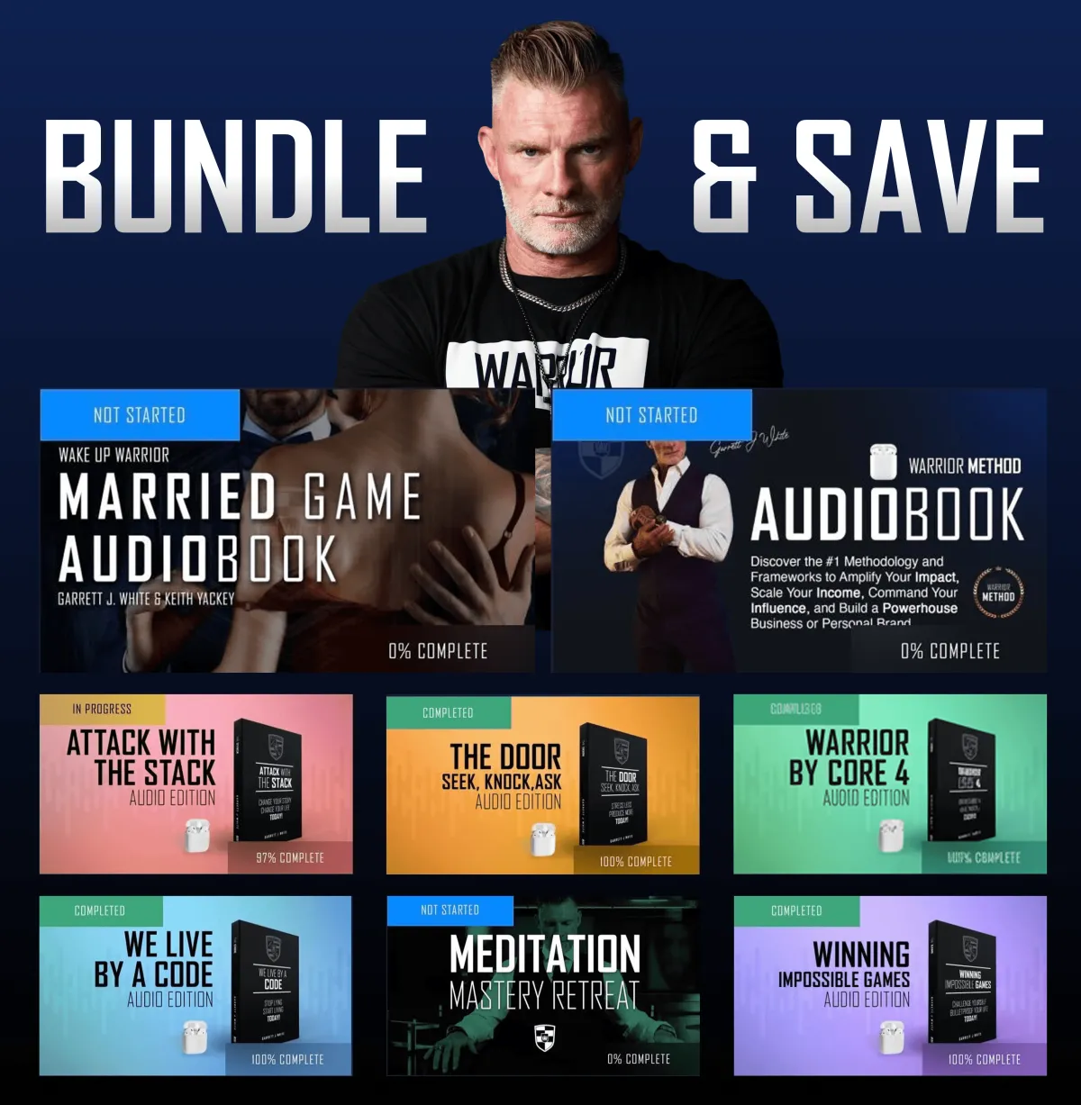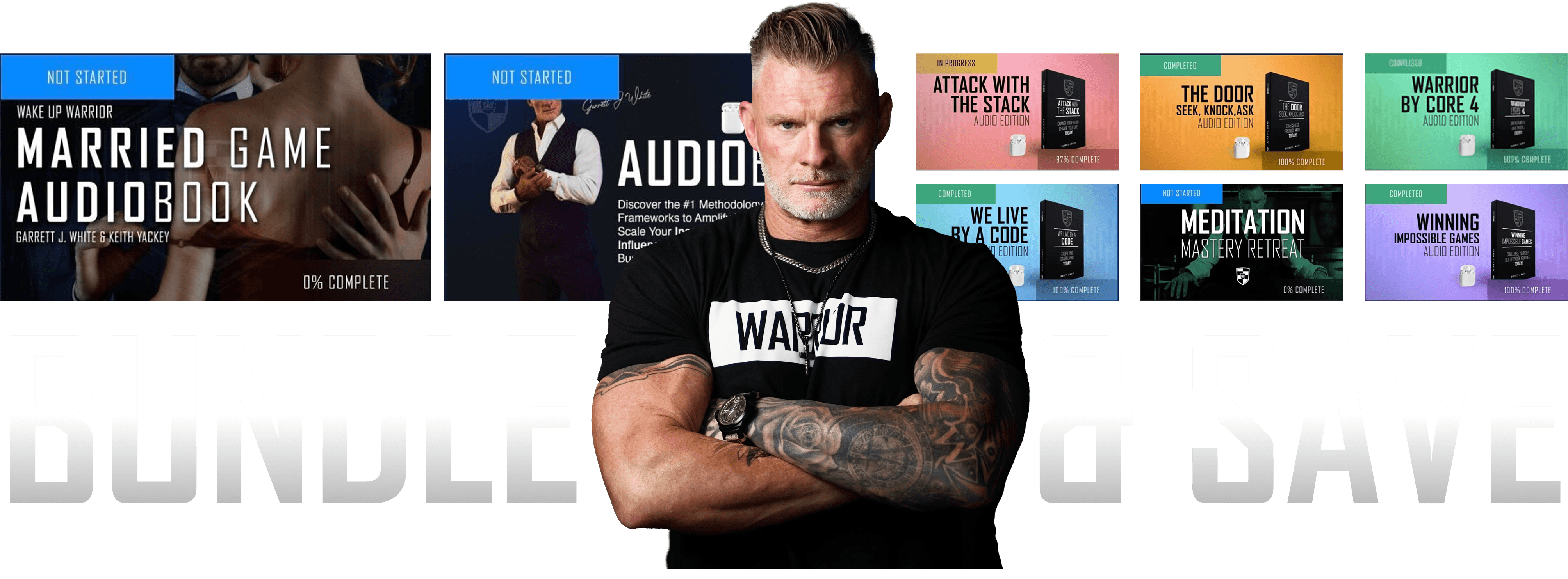 Get instant access to 8 of Garrett's most powerful audiobooks spanning the complete Warrior system — from scaling wealth and leading your family to mastering intimacy with your wife. Not available anywhere else. (Value: $159.92)